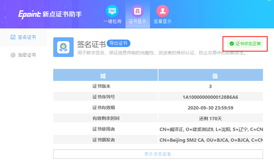 如果“證書檢測結(jié)果”中顯示證書狀態(tài)正常,則表示您的證書Key是可以正常使用的,如下圖: