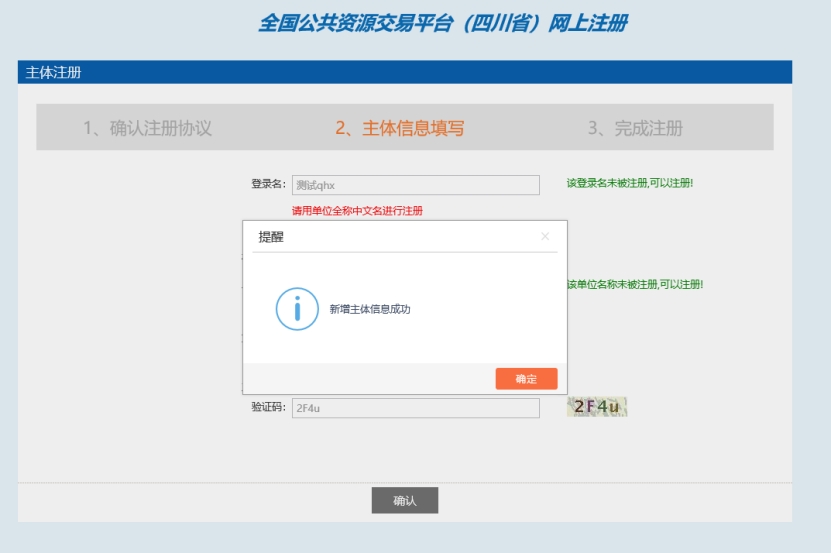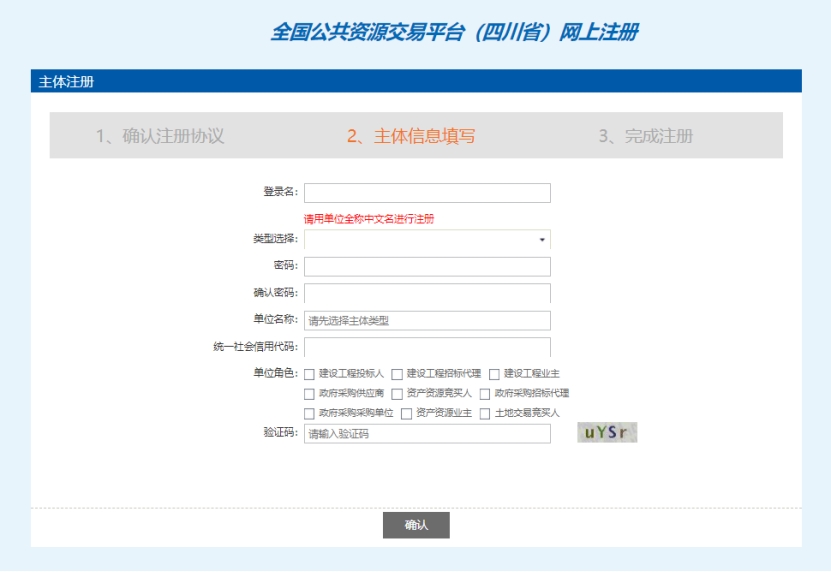 輸入登錄名、密碼等基本信息,如果該登錄名已被注冊(cè)過(guò),必須更換登錄名。如果單位已經(jīng)注冊(cè)過(guò),則不需要重復(fù)注冊(cè)。選擇“主體類型”及“單位角色”(角色可以根據(jù)自己?jiǎn)挝磺闆r多項(xiàng)選擇),輸入驗(yàn)證碼之后,點(diǎn)擊“確認(rèn)”按鈕。