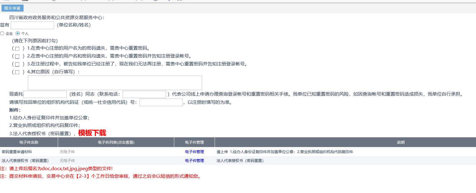 2、填寫相關(guān)資料,點(diǎn)擊【提交申請】按鈕提交審核。如需加急處理,請聯(lián)系交易中心,審核通過后,在您預(yù)留的手機(jī)號(hào)碼上會(huì)收到短信通知,短信上會(huì)告知賬號(hào)和密碼。電話:028-12345