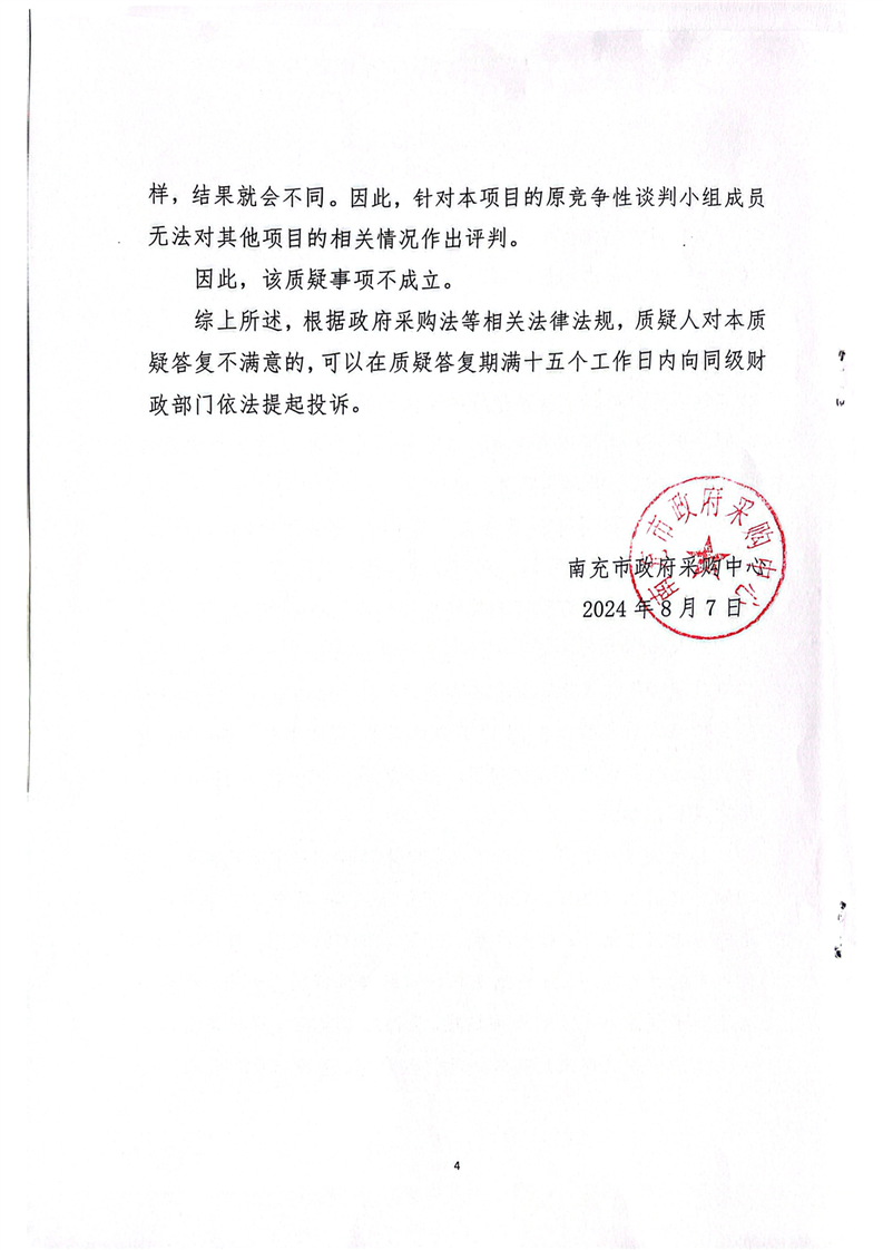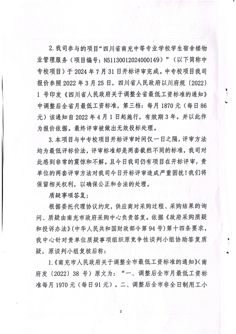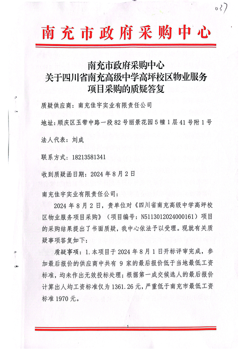 南充市政府采購中心關于四川省南充高級中學高坪校區(qū)物業(yè)服務項目采購的質疑答復