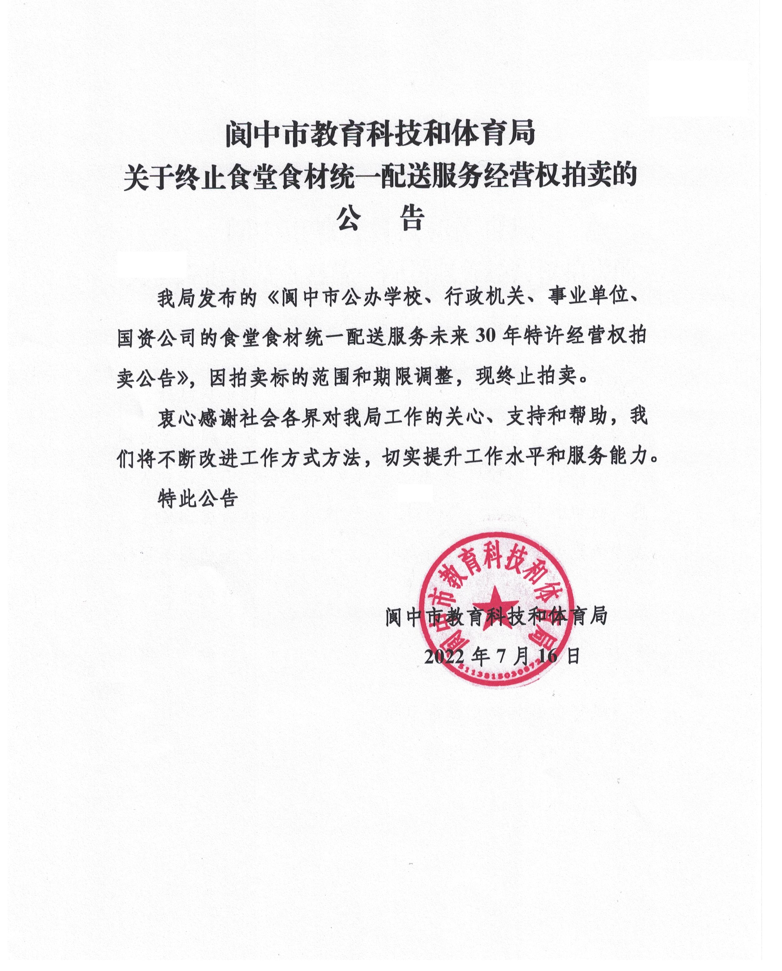 閬中市教育科技和體育局關(guān)于終止食堂食材統(tǒng)一配送服務(wù)經(jīng)營(yíng)權(quán)拍賣的公告