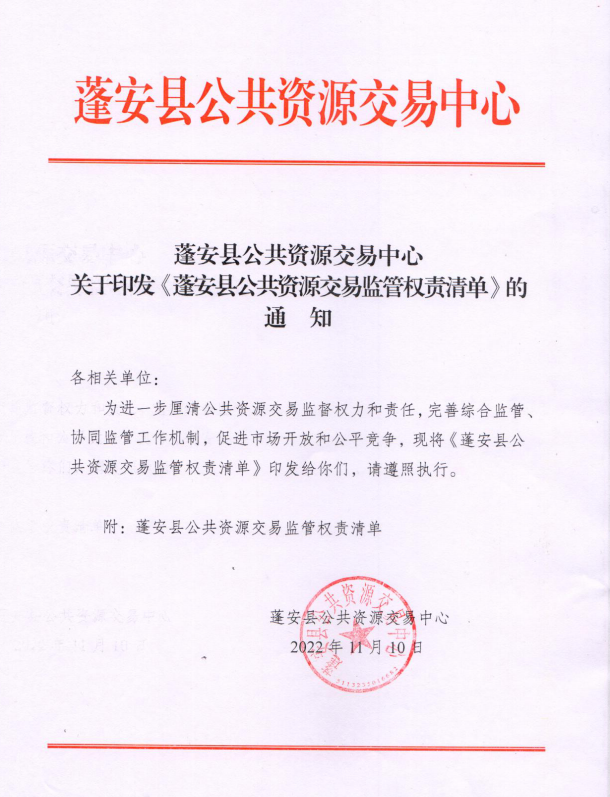 蓬安縣公共資源交易中心關(guān)于印發(fā)《蓬安縣公共資源交易監(jiān)管權(quán)責清單》的通知