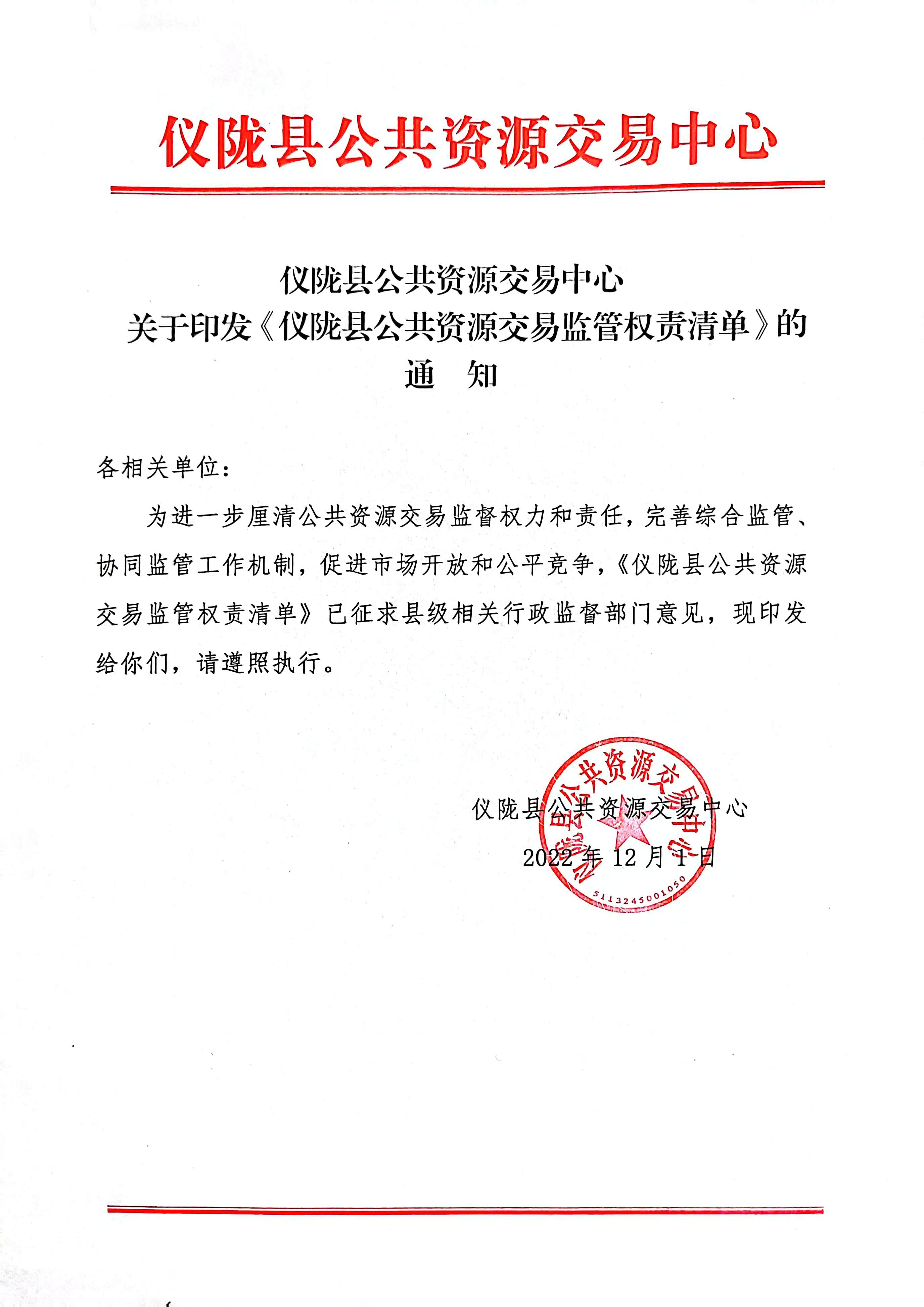 儀隴縣公共資源 交易中心關(guān)于印發(fā)《儀隴縣公共資源交易監(jiān)管權(quán)責清單》的通知