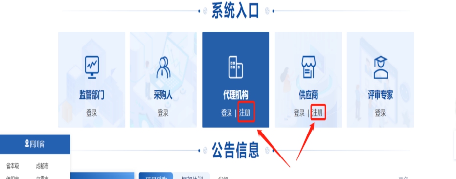 系統(tǒng)用戶打開門戶網(wǎng)站,通過門戶網(wǎng)站的系統(tǒng)入進(jìn)行登錄系統(tǒng),其中代理機(jī)構(gòu),供應(yīng)商可以進(jìn)行注冊(cè),評(píng)審專家可指定時(shí)間進(jìn)行注冊(cè)。如下圖所示:
