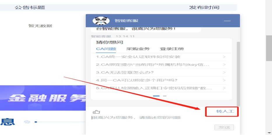 因上線初期,400電話客服電話咨詢量較大,推薦使用在線客服,更能有利于及時(shí)解決問題。如遇智能客服無法解答,可點(diǎn)擊“轉(zhuǎn)人工”進(jìn)行在線人工客服解答。詳見下圖: