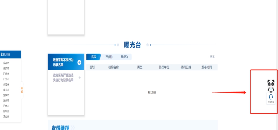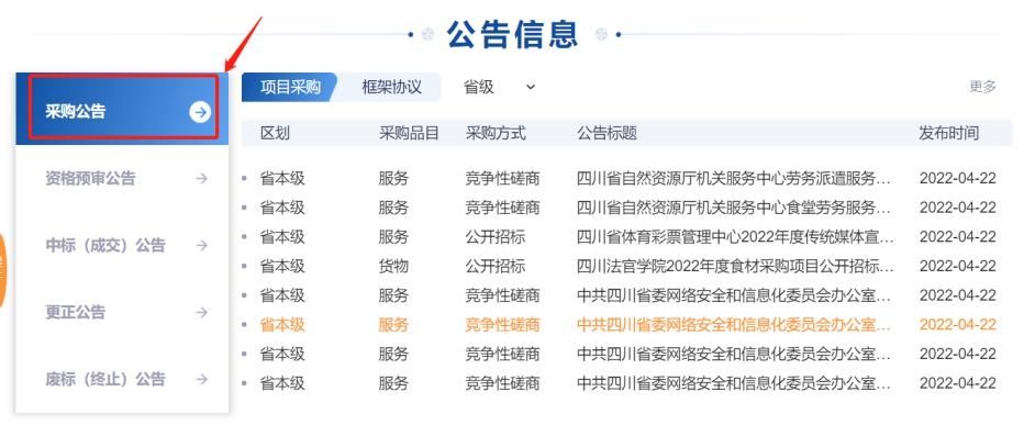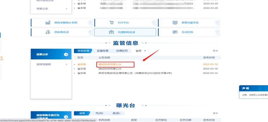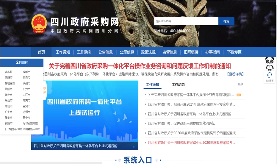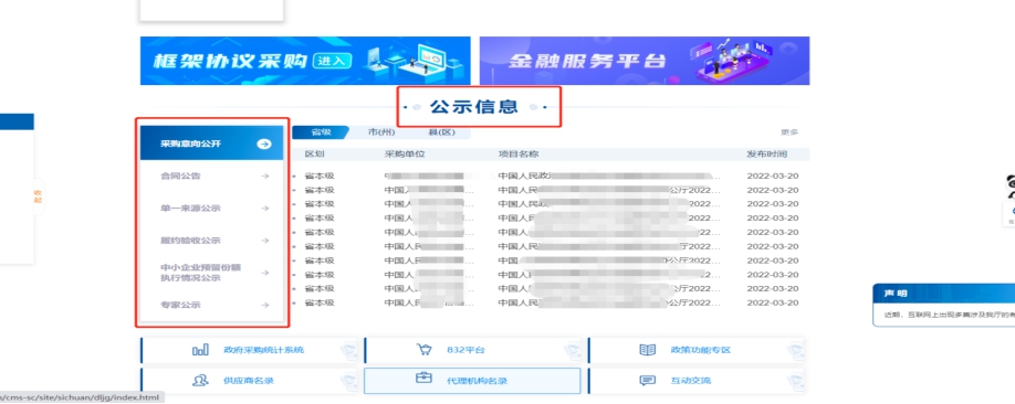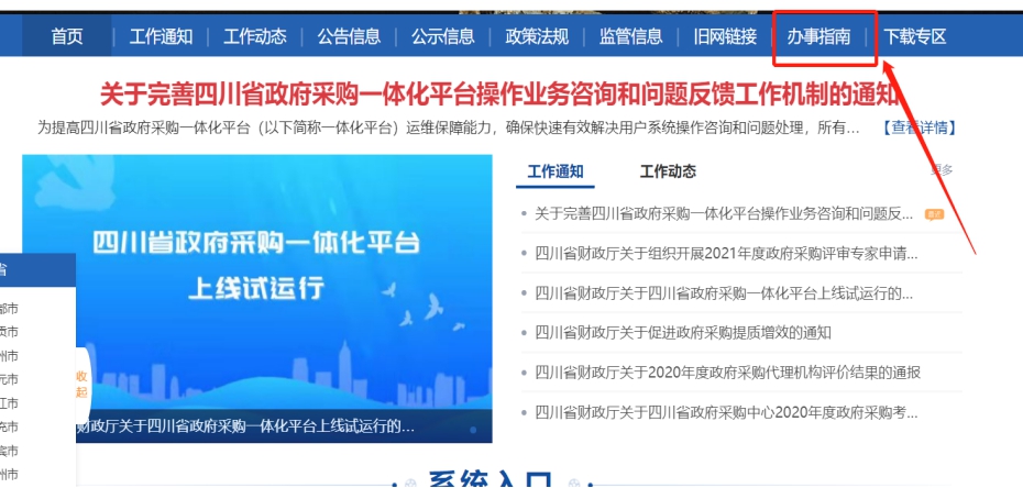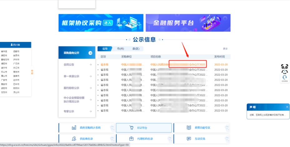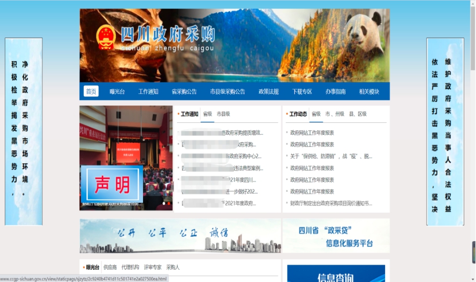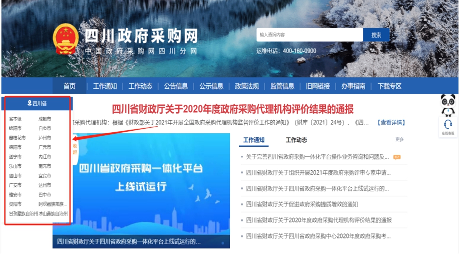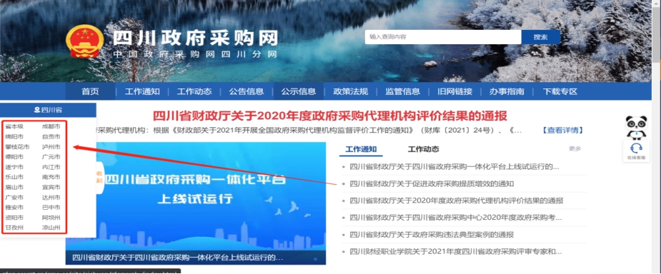 在首頁左邊的彈框中可以點(diǎn)擊四川省各個(gè)地州直接查看各個(gè)地州的公告信息,如下圖所示: