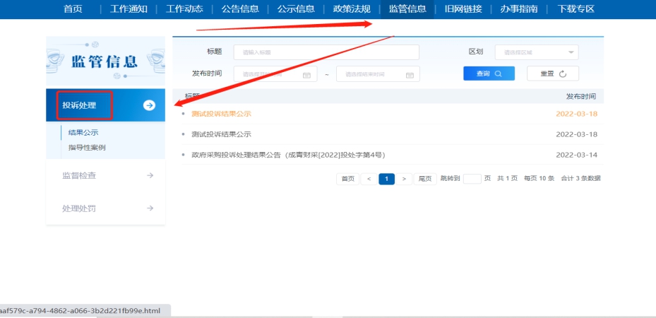 監(jiān)管信息公示的模塊包括:投訴處理、監(jiān)督檢查、處理處罰。如下圖所示: