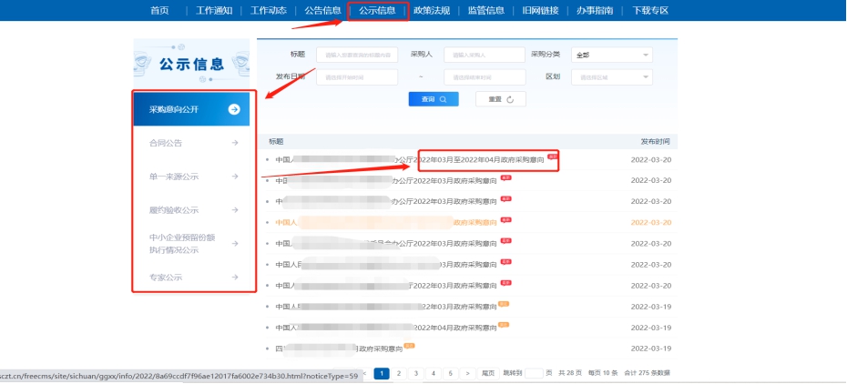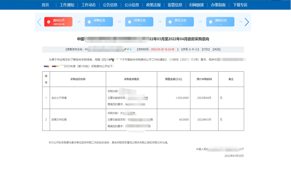 展示的公示信息包括采購意向公開、合同公告、單一來源公示、履約驗(yàn)收公示、中小企業(yè)預(yù)留份額執(zhí)行情況公示和專家公示等,點(diǎn)擊對(duì)應(yīng)標(biāo)題進(jìn)入信息詳情頁,如下圖所示: