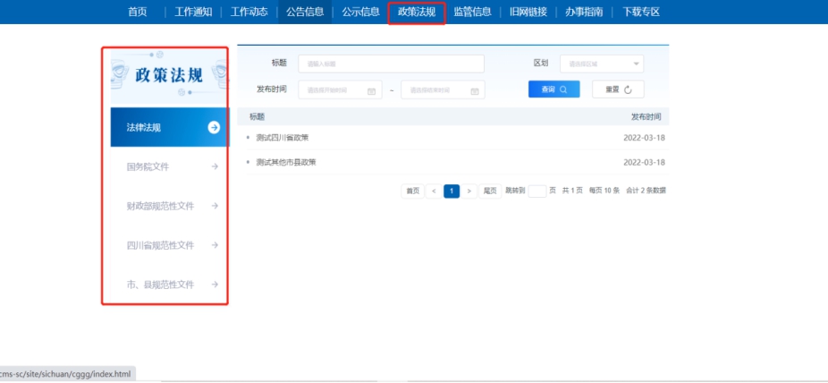 展示對(duì)應(yīng)的政策法規(guī)有法律、行政法規(guī)、國(guó)務(wù)院文件、四川省政府采購規(guī)范文件和其他市縣規(guī)范性文件等,點(diǎn)擊對(duì)應(yīng)的標(biāo)題進(jìn)入詳情頁,如下圖所示: