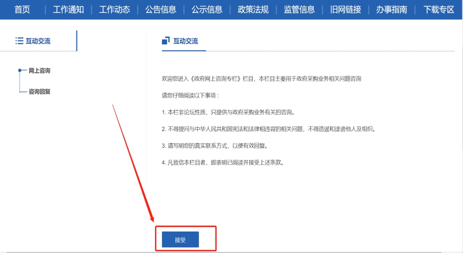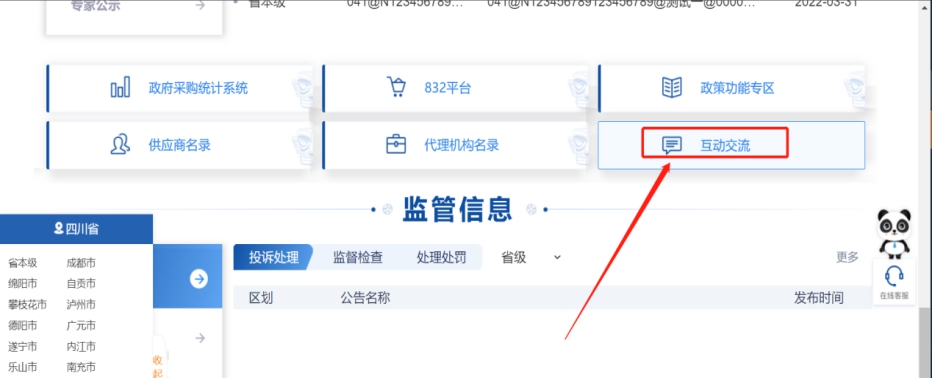 步驟一:瀏覽器打開四川政府采購網(wǎng),進(jìn)入【首頁】-【公示信息】 -【互動(dòng)交流】。詳見下圖: