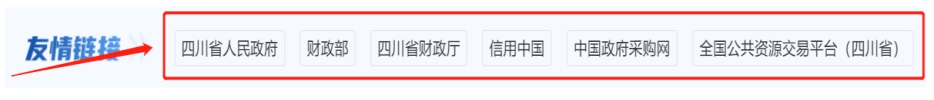 在門戶主頁最下方的友情鏈接欄目是與政府采購有關(guān)聯(lián)的其他部門網(wǎng)站鏈接以及交易平臺(tái)等,如圖所示,例如:四川省人民政府、財(cái)政部、四川省財(cái)政廳、中國(guó)政府采購網(wǎng)和全國(guó)公共資源交易平臺(tái)(四川)等,點(diǎn)擊對(duì)應(yīng)的鏈接,即可打開相應(yīng)的網(wǎng)址鏈接。如下圖所示: