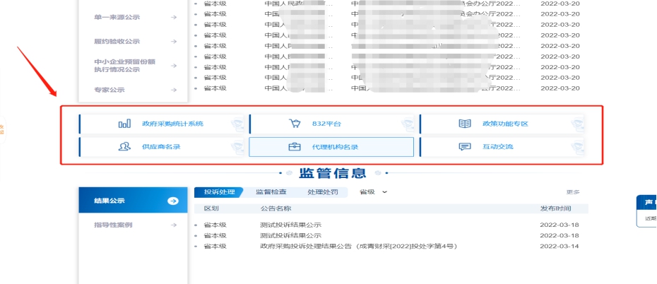 在信息公示欄的最下方具有六個(gè)快捷鏈接入口,分別是:政府采購統(tǒng)計(jì)系統(tǒng)、832平臺(tái)、政策功能專區(qū)、供應(yīng)商名錄、代理機(jī)構(gòu)名錄和互動(dòng)交流。點(diǎn)擊圖片或文字鏈接即可直接進(jìn)入對(duì)應(yīng)的網(wǎng)址。如下圖所示: