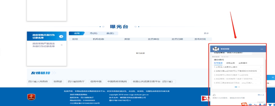 政府采購網(wǎng)的在線智能客服鎖定位置在門戶頁面中間位置的正右方,如圖所示點(diǎn)擊熊貓頭像或者“在線客服”字樣都可以打開與智能客服的對(duì)話框。如下圖所示: