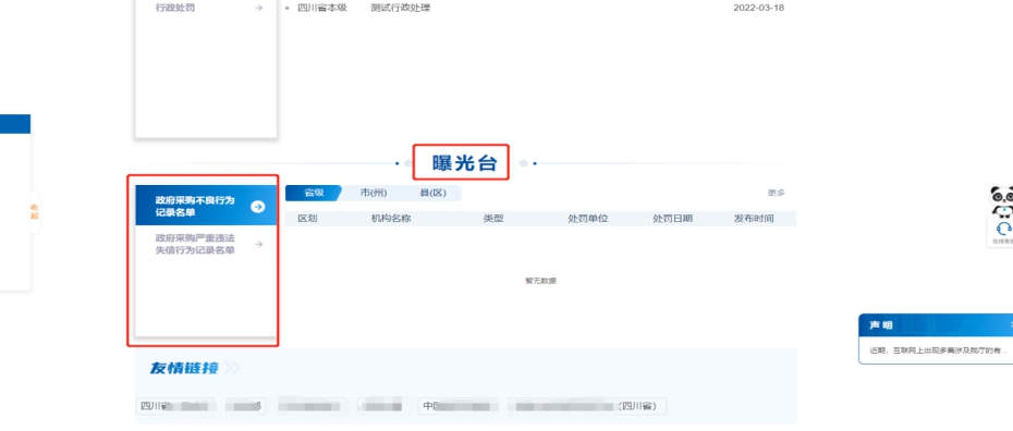 曝光臺(tái)分為省級(jí)/市級(jí)/縣(區(qū))三個(gè)區(qū)劃等級(jí)對(duì):政府采購不良行為記錄名單和政府采購嚴(yán)重違法失信行為記錄名單進(jìn)行公告曝光。如下圖所示: