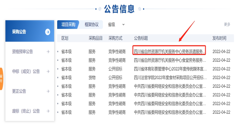 點(diǎn)擊對(duì)應(yīng)的公示信息,點(diǎn)擊選中的黃色字段即可進(jìn)入公告查看具體內(nèi)容,右側(cè)顯示采購單位、項(xiàng)目名稱和發(fā)布時(shí)間等內(nèi)容。如下圖所示: