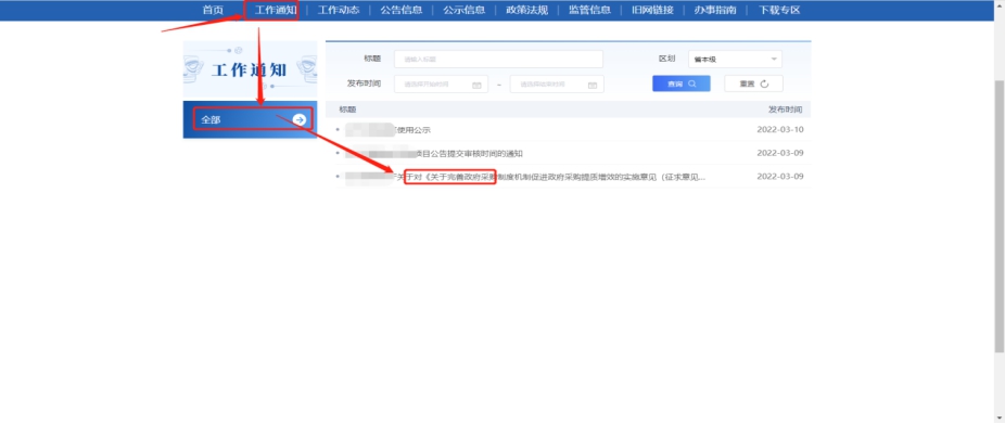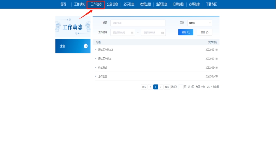包括:工作通知、工作動(dòng)態(tài)、采購公告、信息公開、政策法規(guī)、監(jiān)管信息、舊網(wǎng)鏈接、辦事指南和下載專區(qū),如下圖所示: