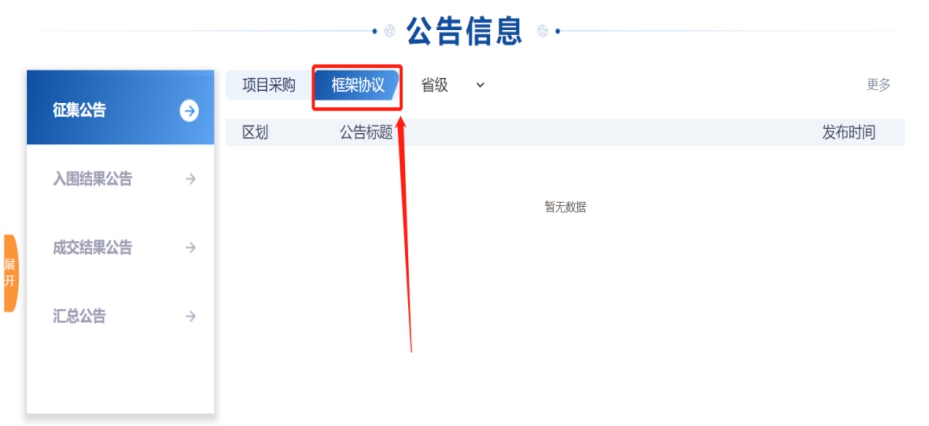 框架協(xié)議公告欄包括:征集公告、入圍結(jié)果公告、成交結(jié)果公告和匯總公告,點(diǎn)擊對(duì)應(yīng)的公告內(nèi)容進(jìn)入查看詳細(xì)公告信息。如下圖所示: