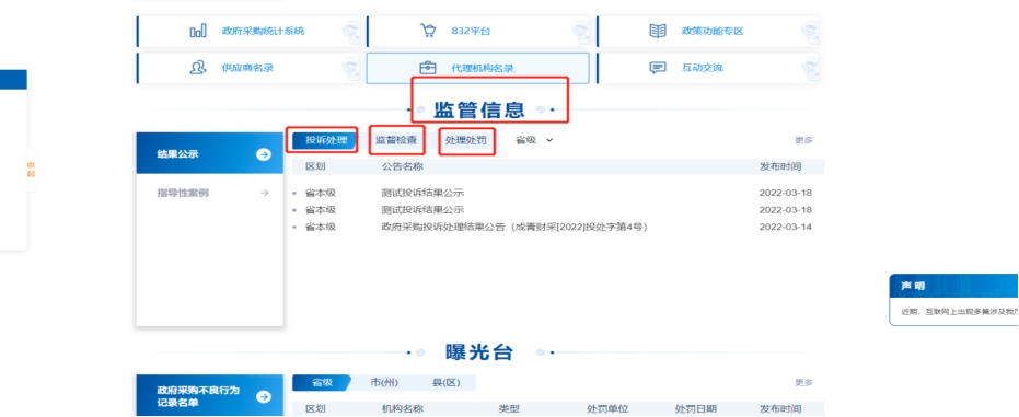 展示監(jiān)管部門處理的質(zhì)疑投訴、監(jiān)督檢查和處罰等信息,點(diǎn)擊對(duì)應(yīng)的模塊查看對(duì)應(yīng)的詳細(xì)信息,如下圖所示: