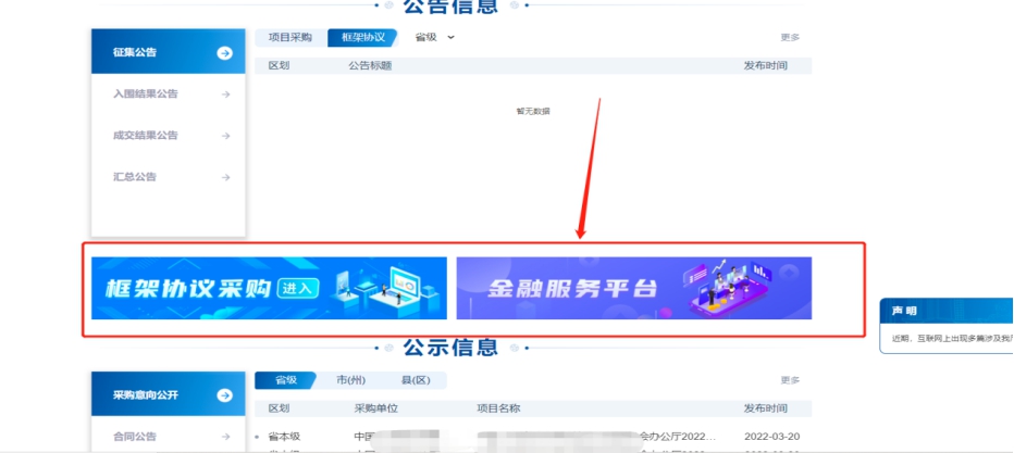 快捷圖片鏈接:點(diǎn)擊框架協(xié)議采購圖片任意位置,即可進(jìn)入框架協(xié)議采購;點(diǎn)擊金融服務(wù)平臺(tái)任意位置,即可進(jìn)入金融服務(wù)平臺(tái)。如下圖所示: