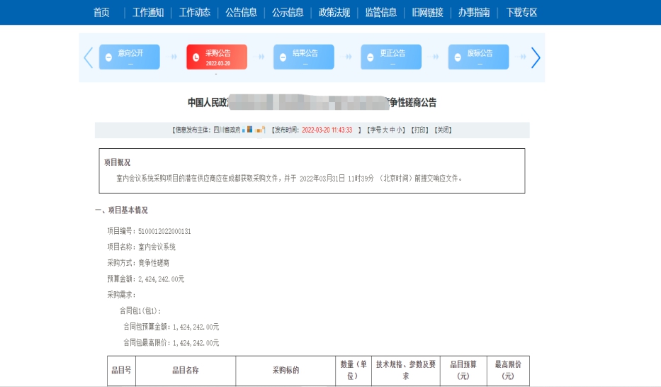 展示項(xiàng)目采購和電子賣場(chǎng)公告信息,點(diǎn)擊對(duì)應(yīng)的公告標(biāo)題進(jìn)入查看項(xiàng)目采購各個(gè)環(huán)節(jié)的公告信息詳情,展示如下圖所示: