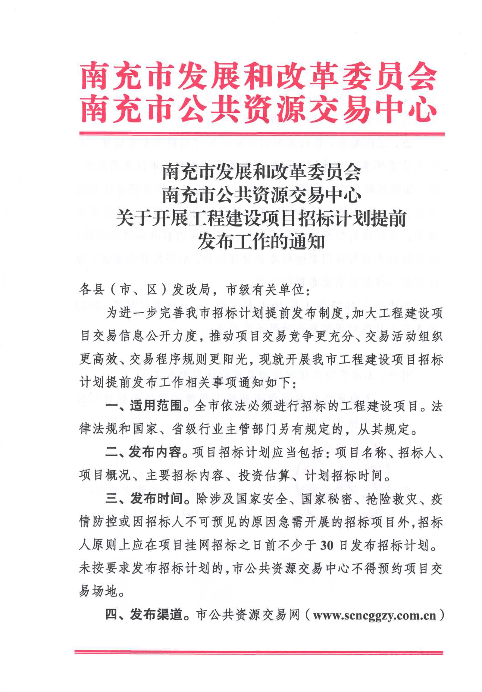 南充市發(fā)展和改革委員會、南充市公共資源交易中心關于開展工程建設項目招標計劃提前發(fā)布工作的通知