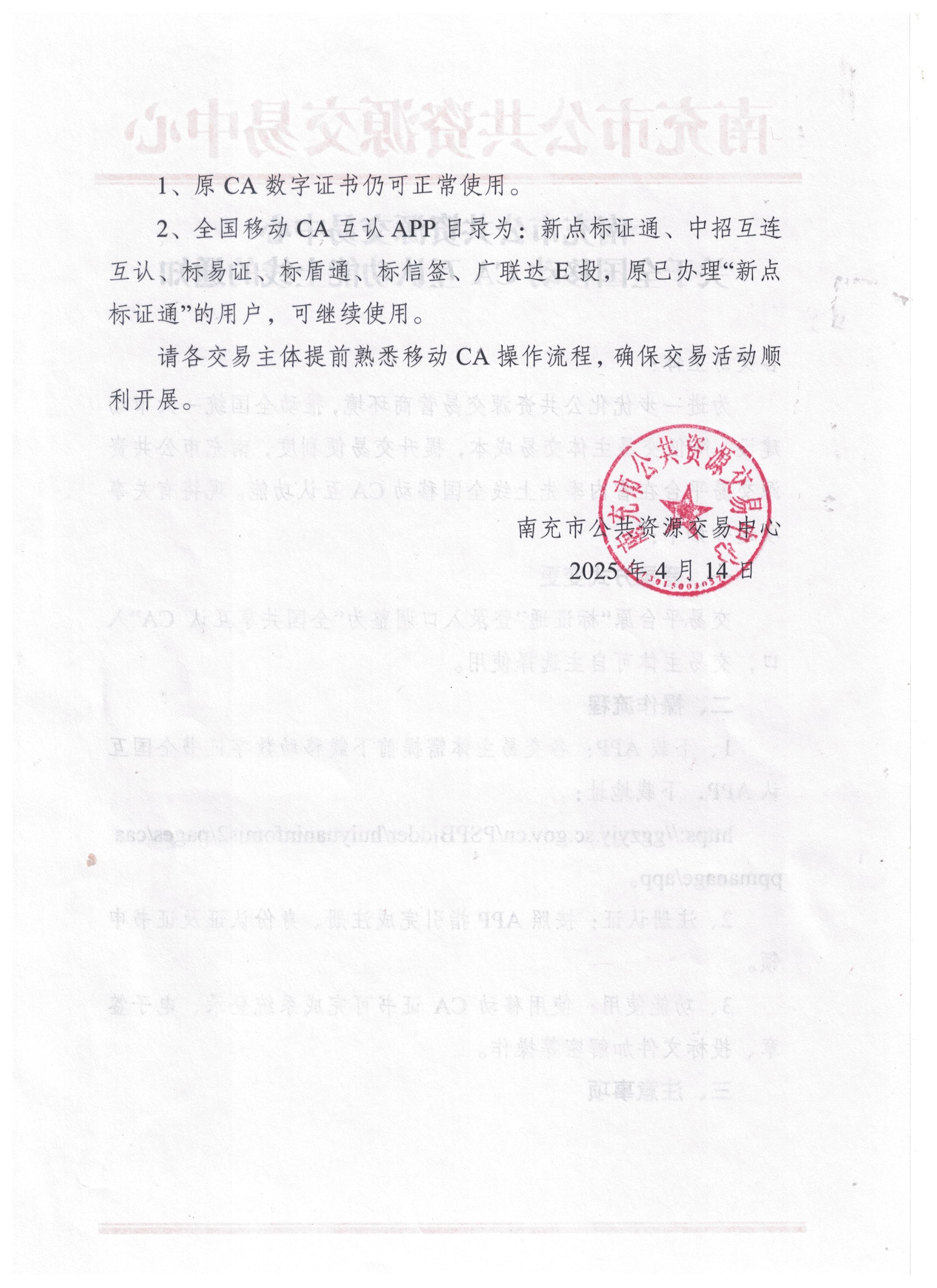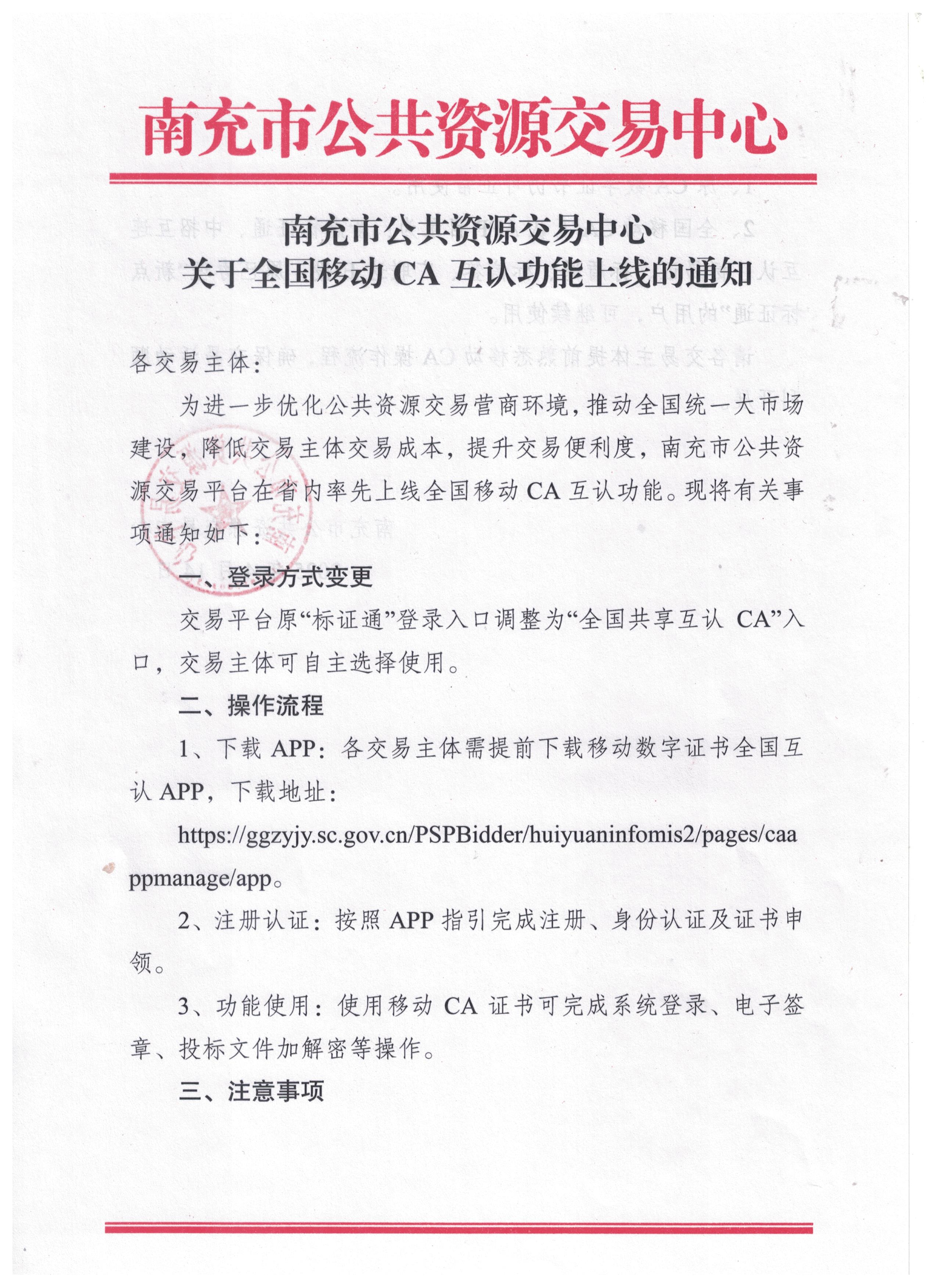 南充市公共資源交易中心關(guān)于全國(guó)移動(dòng)CA互認(rèn)功能上線的通知